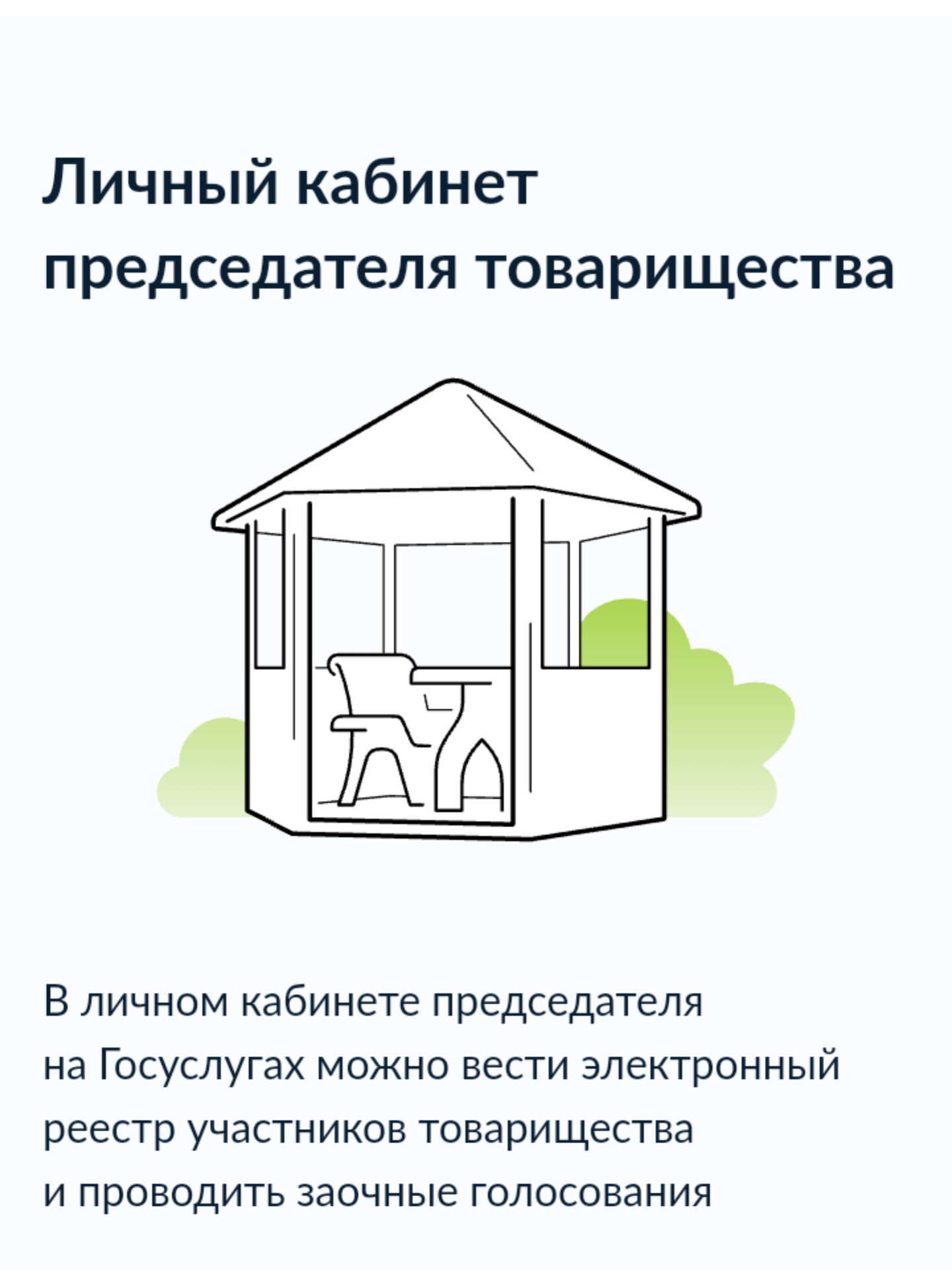 После регистрации в личном кабинете на Госуслугах председатель сможет вести электронный реестр участников товарищества и проводить заочные голосования.