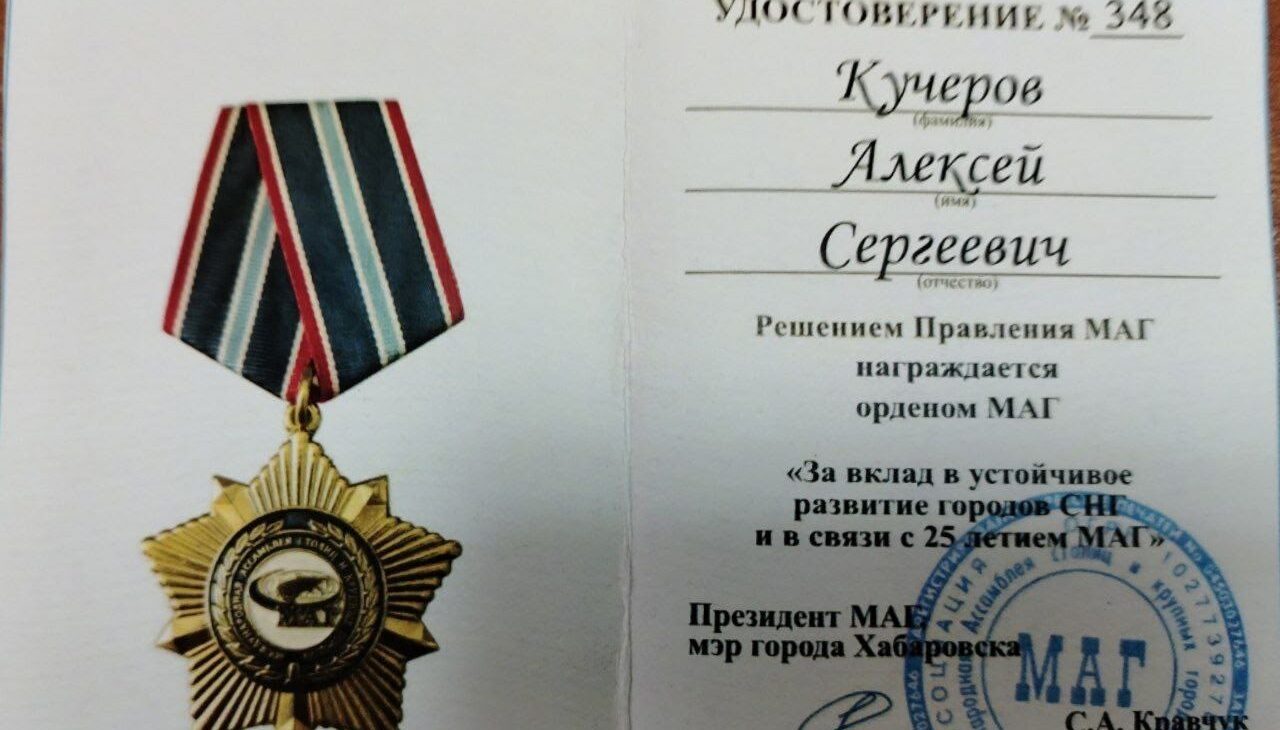 Решением Правления Международной Ассамблеи столиц и крупных городов (МАГ) Алексей Кучеров был удостоен ордена МАГ за вклад в устойчивое развитие городов и в связи с 25-летием со дня основания Ассамблеи.