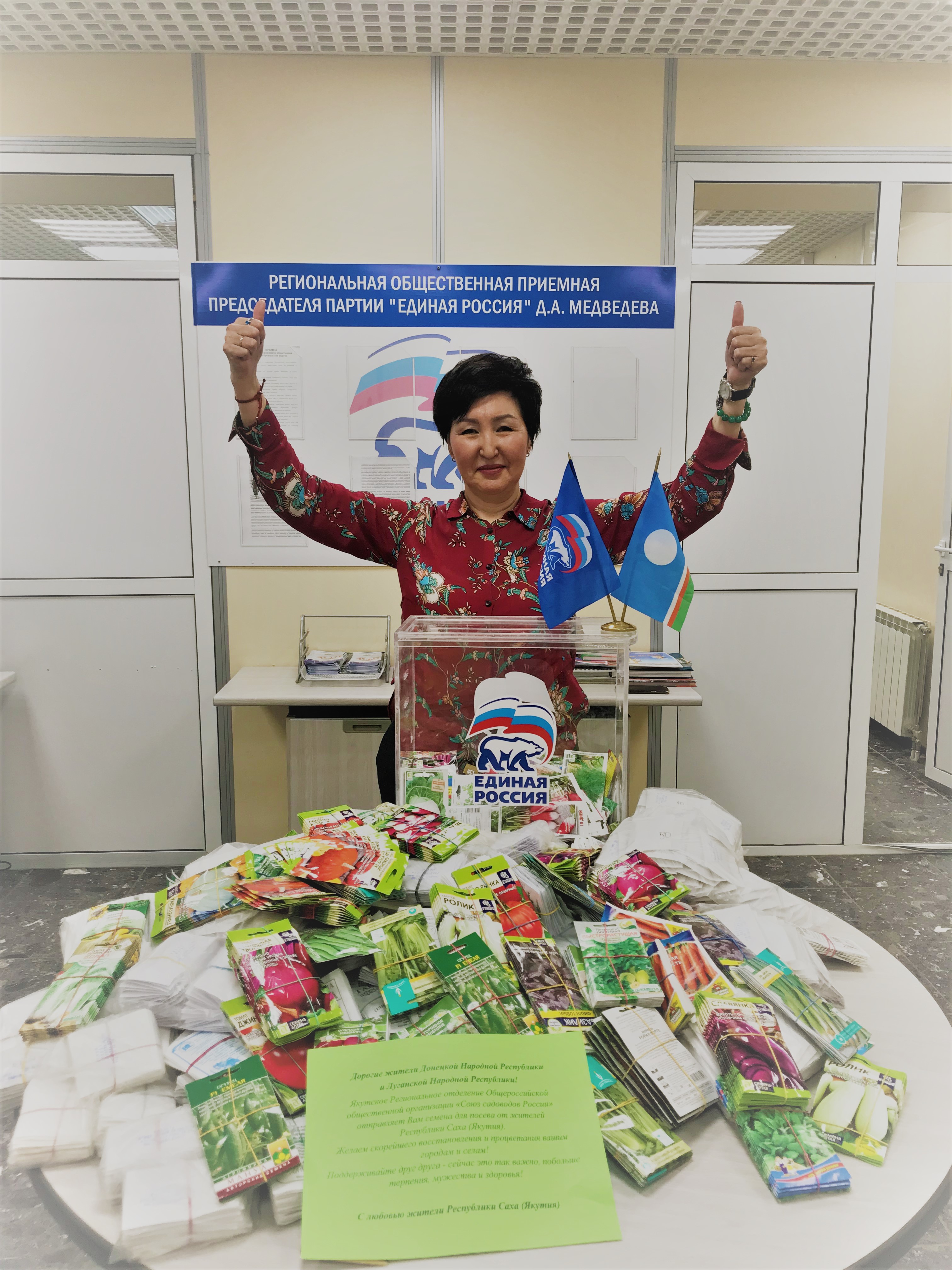 Всероссийская политическая партия «Единая Россия» запустила акцию «Добрый огород» по сбору семян жителям Луганской и Донецкой народных республик и освобожденных территорий Украины. Якутское региональное отделение Союза садоводов России и депутат Государственного собрания Ил Тумэн Республики Саха (Якутия) Иван Данилов передали в общественную приёмную «Единой России» 3000 пакетиков семян овощных культур, собранные садоводами и огородниками Якутии, для благополучного проведения посевной компании и обеспечения сезонными продуктами.